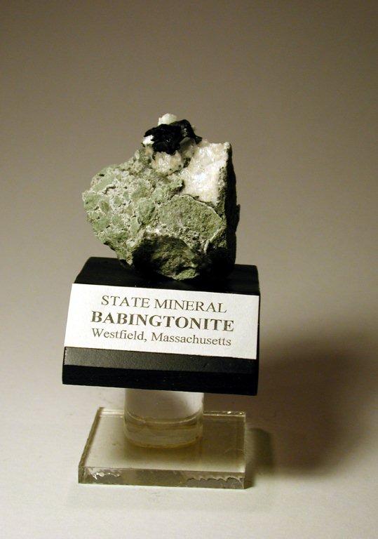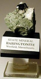 Babingtonite, the State Mineral of Massachusetts, is named after Irish physicist and mineralogist W. Babington.It belongs to a class of minerals called silicates, and appears as small, wedge-shaped black crystals. It is hard (5.5–6 on the Mohs scale), heavy, and exhibits good prismatic cleavage and uneven fracture. Crystals of Babingtonite growing with Prehnite or Calcite can be found lining basalt, gneiss, or granite cavities. Babingtonite is considered a mineral of interest to collectors and mineralogists.