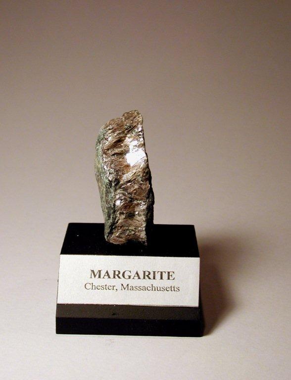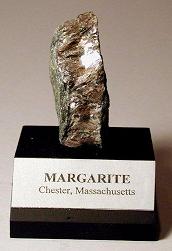 Margarite is a pink colored mineral that is usually found with corundum in emery deposits. Margarite is calcium, aluminum silicate that very closely resembles muscovite mica, but is harder. Margarite was first discovered in 1864 by Dr. H. S. Lucas in the town of Chester, when a very rich emery deposit was found and a mining operation called the Chester Emery Mines was started. Emery was mined to make abrasive products such as grinding wheels and wet stones and also ground to produce a type of sandpaper called emery cloth. The Chester Emery Mines was the first emery mine in the United States. Mining operations finally ended in 1913 because of less expensive sources of emery found outside the country. Margarite can still be collected there today along with about 40 other minerals. Collectors have been visiting the Chester Emery Mines for many years to dig through the discarded material known as “tailings” or “dumps” in search of these buried mineral treasures.