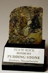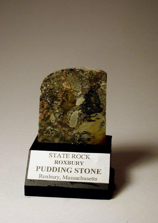 Puddingstone , the State Stone of Massachusetts, is a conglomerate rock made up of a mixture of different, irregular sized grains and pebbles held together by a finer matrix, usually formed from quartz sand. The sedimentary rock is formed in river channels and may contain various minerals such as Chromite, Corundum, Platinum, Diamonds, Gold, Sapphire, and Zircon. Its name is said to derive from a resemblance to Christmas pudding. There are different types of puddingstone, composed of varying mixture, found at geographical locations throughout the world. Roxbury puddingstone, principally found in and around Boston, can be seen in many buildings in the Boston area.