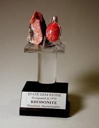 Rhodonite, the State Gemstone of Massachusetts, is an attractive mineral that is often carved and mostly cut as cabochon jewelry. Faceted stones are rare and highly prized by collectors. It is named after the Greek word for rose, rhodon. Its rose-pink color is distinctive. It is often confused with Rhodochrosite which is also pink to red in color, but streaked with white minerals such as calcite and is reactive to acids. Rhodonite does not react when tested with acids and usually is associated with black manganese and pyrite.
